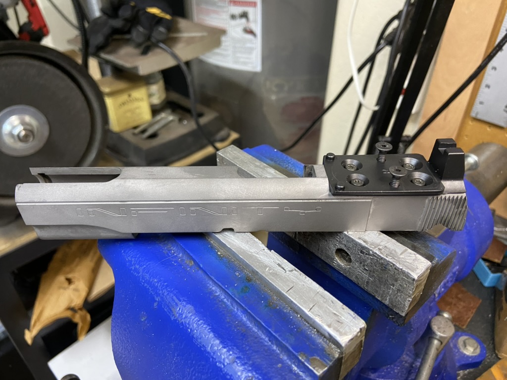 I then secured the slide in the vise and found the center line and after touching off the front edge of the cut I started moving the cutter about .008″ at a time, spinning it at about 400 RPM. The chips were flying everywhere but it did the job!