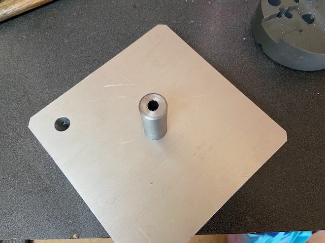 I started with a 6″ aluminum plate I found in my metal bin. It is pretty much square already, so I just found the center and drilled and tapped it for 5/8-24 thread. Then I drilled the 1/2″ hole for the boring bar and M5 threaded holes on the opposite sides of that corner for the set screws to secure the boring bar in place.